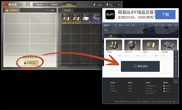 请在超凡先锋游戏内,前往“交易-> 拍卖-> 寄存柜”或“交易-> 拍卖-> 外观拍卖”,点击“交易平台”,跳转BUFF网页自动完成绑定