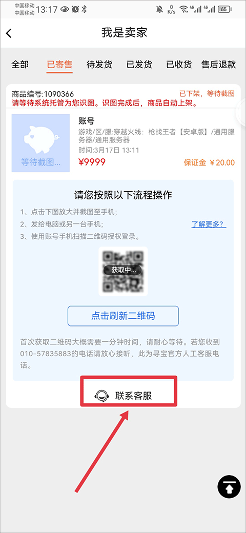 1、按照上面第五条步骤开始,在已寄售页面中找到要取消的订单,并点击联系客服