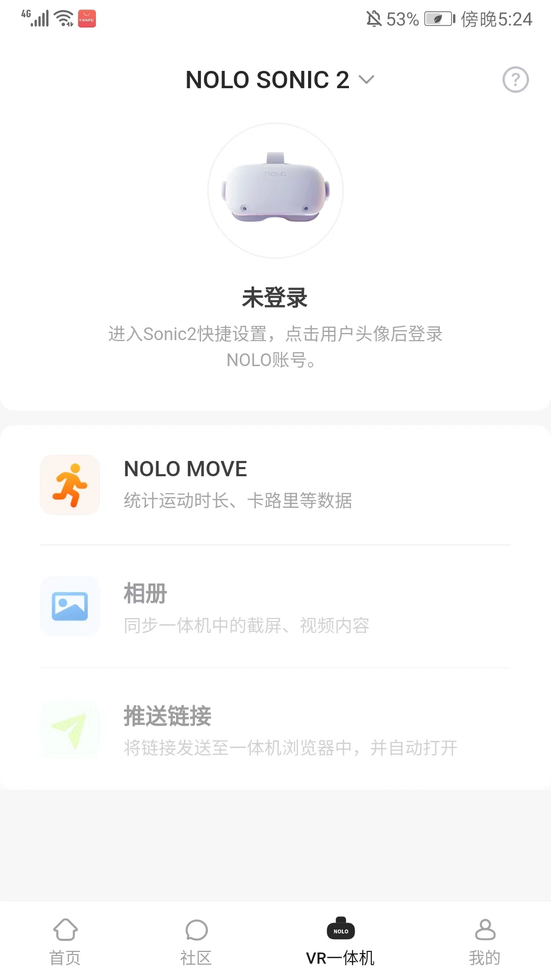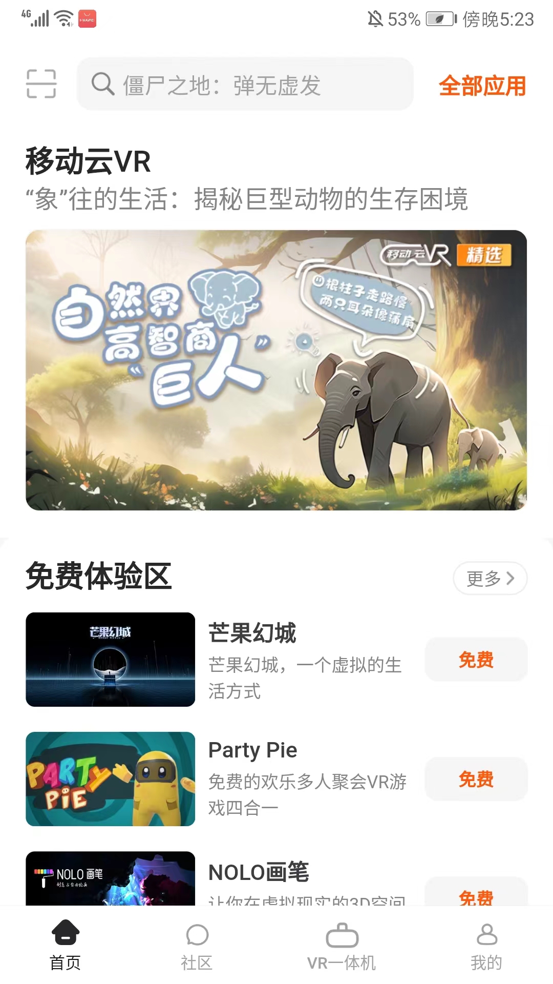1、打开nolo助手安卓版,进入应用主界面,可看到包括首页、社区、VR一体机和我的栏目,在首页界面包括各种各样的游戏应用,用户可根据喜欢选择或者搜索,这里以【芒果幻城】为例,