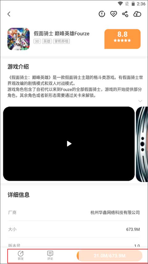 3、在下方你可以进行转发、评论以及下载等操作,下面就需要将游戏下载到手机上进行安装操作。