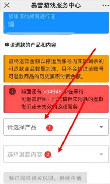 选择退款的【产品】和【退款内容】,点击【我已阅读相关内容,继续申请】。