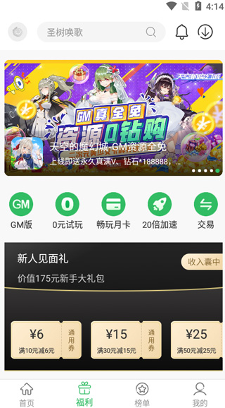 3、点开福利,可以看到有gm版、0元试玩、畅玩月卡、20倍加速等等;