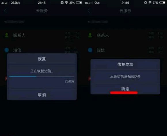 根据信息量,云服务很快通过网络将信息恢复到手机中,完成后点确定