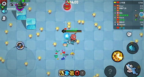 中间下面为技能栏,吃蘑菇捡宝石获得积分会升级,升级会获得三个技能,但只能选择其中一个留下来。右上角为积分排行榜,这是输赢的判断条件,积分最高的获胜。游戏中也可以用语音,也可以用这个号角发送信号消息。