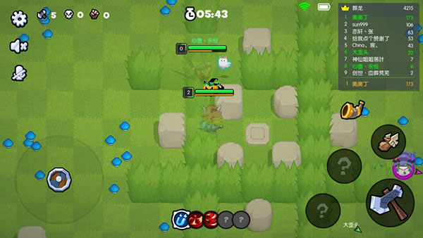 因为弱小,不要轻易开团,若要开团,请每人准备1个锤子或是炸弹,这会是你们撬开龟缩成一团的魔王战队大门的敲门砖。最重要的是永远不要冲到战场的中心,要赢,就在场边游走,时机一到就扔锤子锤子这种伤害高,距离远还自动锁敌的东西,一定要好好利用呐