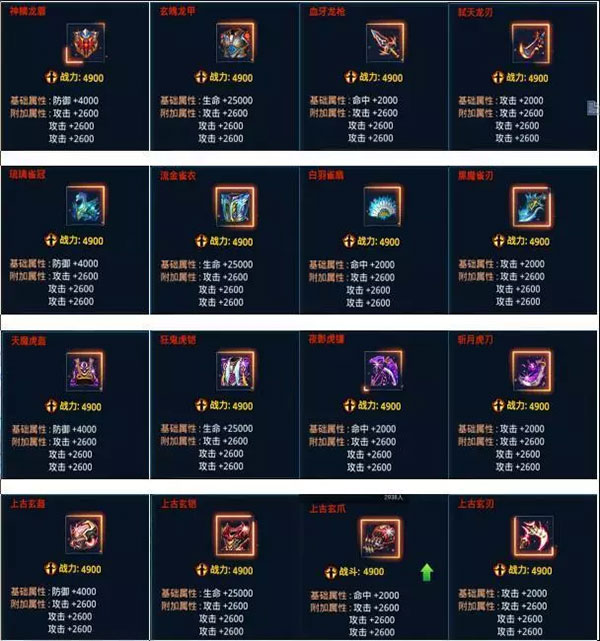 1、神器的基础属性神器的属性有防御、生命、命中、攻击和闪避五种,基础属性只有一条,主要有防御、生命、命中、攻击四种类型。所有神器的基础属性主要由部位决定,像“左上角”部位的龙盾、鸟冠、虎盔、龟盔的基础属性为防御;“右上角”部位的龙甲、鸟衣、虎铠、龟铠的为生命;“左下角”部位的龙矛、鸟扇、虎镰、龟爪的为命中;“右下角”部位的龙刀、鸟刀、虎刀、龟刀的为攻击。