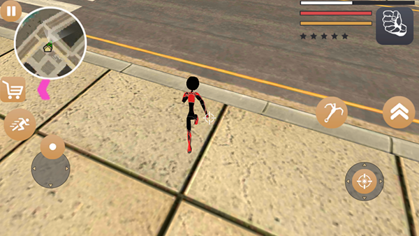 左侧移动、加速,右侧绳索,攻击(跳跃),跳跃,右上侧的武器更换以及血量、经验的显示都实时更新,一览无遗,凭借着大家自由的玩法,与其他帮派的人物进行交火,期间杀人能够获得经验,杀多了会产生星级,警察和其他附近角色会特殊照顾你对你展开火热的进攻,而如何存活,如何将其他人物击杀则是你所需要完成的任务。