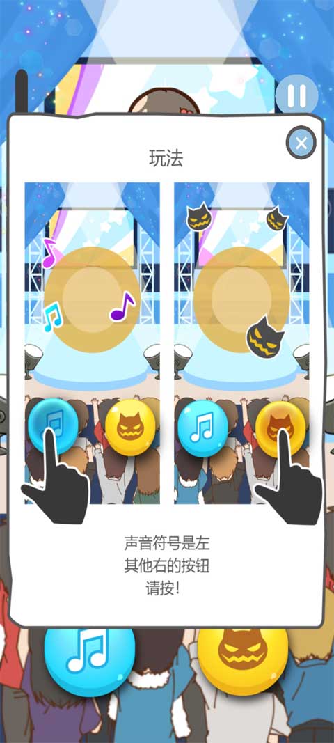 1、游戏的玩法非常简单,就是当女孩身边出现声音的符号,那么就点左边的按钮,而除声音符号之外的都按右边的按钮。