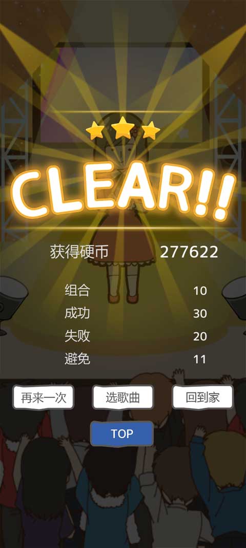 4、这时结束页面会显示你获得的金币数量、成功以及失败的次数等,你可以再次挑战,也可以回家装饰房子。