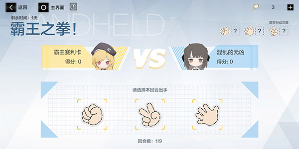 天眼在游戏前一定要开启,若当前回合数大于预测行动数,则我方全出克制敌方的行动,这样就能保证拿到低保分,只要运气不差就能获胜。由于最终关七实的行动是无法被天眼预测的,因此建议按照“拳头、剪刀、布”的顺序出招,即可拿到3分。