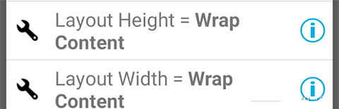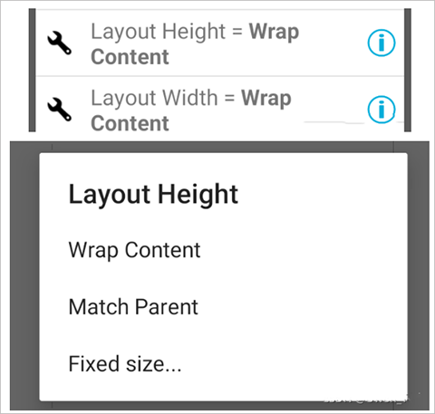 6、然后我们把两个小线性布局的宽度调成屏幕的宽度。点击小正方形虚线框,找到Layout Width = Wrap Content这一项,点击之后弹出如下的窗口:
