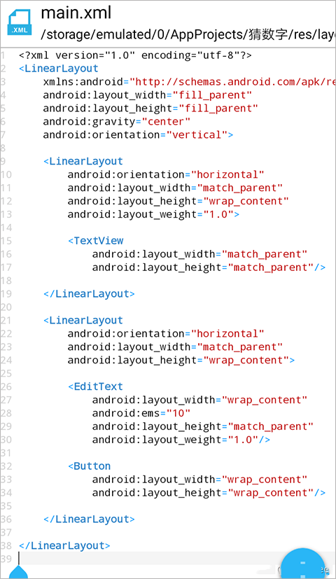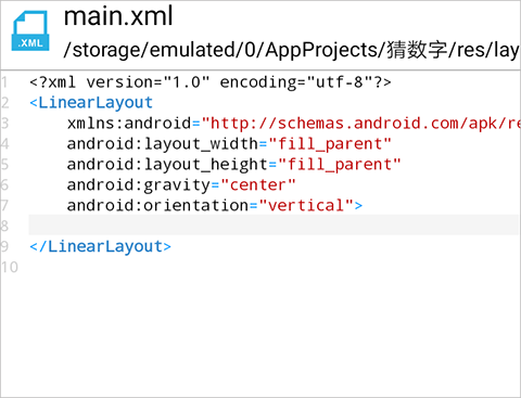 18、 界面的设计基本上就结束了。点击返回,我们就可以退回到main.xml文件。看!AIDE已经为我们自动写好了所有的代码,多么神奇啊!