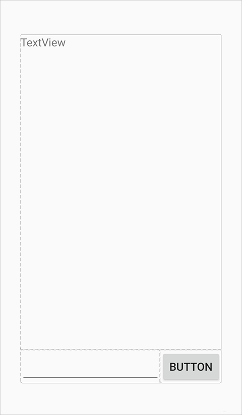 里面涉及到的控件有三个:文本框,编辑框和按钮。这些控件都需要放在一个“容器”里面,以便于控制其位置。这里我们使用的“容器”是比较简单的线性布局(LinearLayout)。线性布局里面的控件都会按照左右顺序或者上下顺序依次排成一条直线。而在我们的这个界面里面,却是编辑框和按钮水平排列在屏幕底部,然后两者作为一个整体和上面的文本框上下排列在一起。