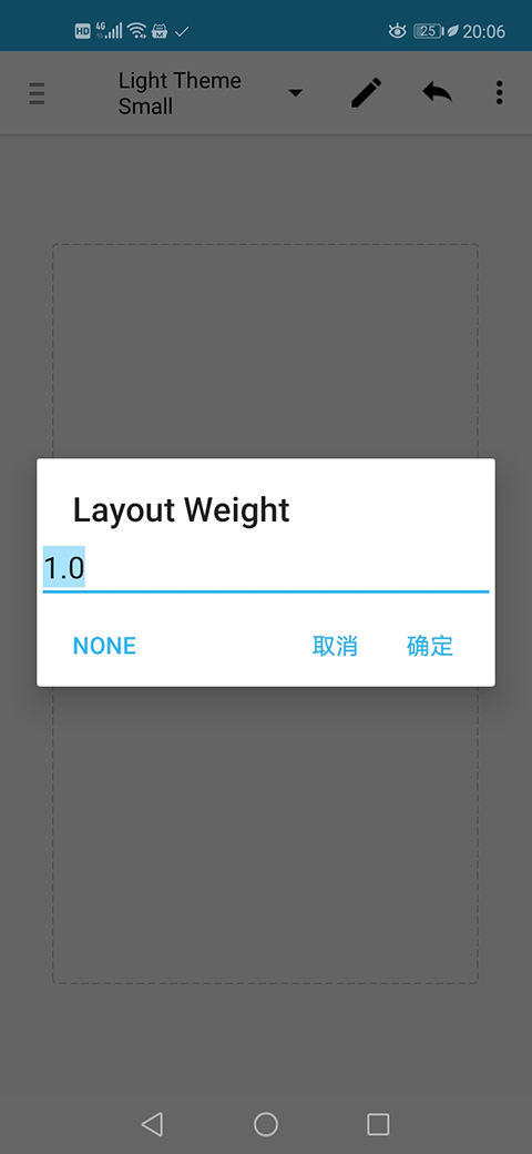 8、点击上面的线性布局,找到Layout Weight一项,并设置为1.0。这个属性比较复杂,所以此处不再细讲。完成之后效果如下: