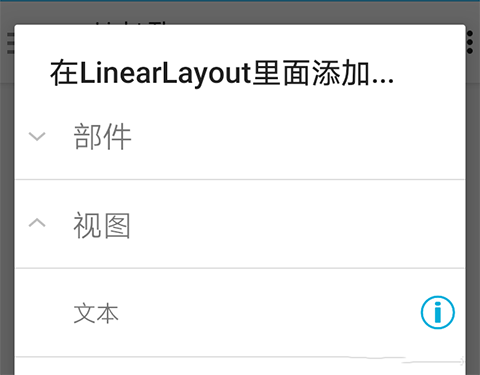 9、 可以看到,上面的线性布局已经填满了所有的空白高度。接下来,我们往两个线性布局里面添加控件。首先点击上面的线性布局,然后选择里面添加,在视图一项里找到文本,点击即可。