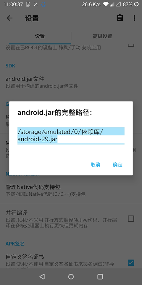 使用方法:将SDK存放路径复制下来,进入aide的设置-构建 & 运行,将绝对路径粘贴到android.jar文件的对话框。