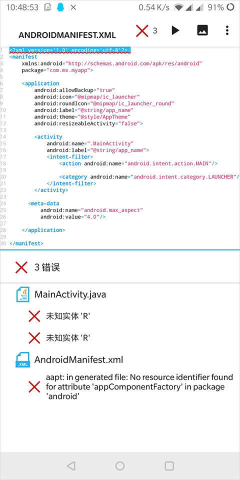 1、使用aide创建的androidx项目会报一个错误:aapt:in generated file:no resource identifier found for attribute 'appComponentFactory' in package 'android'