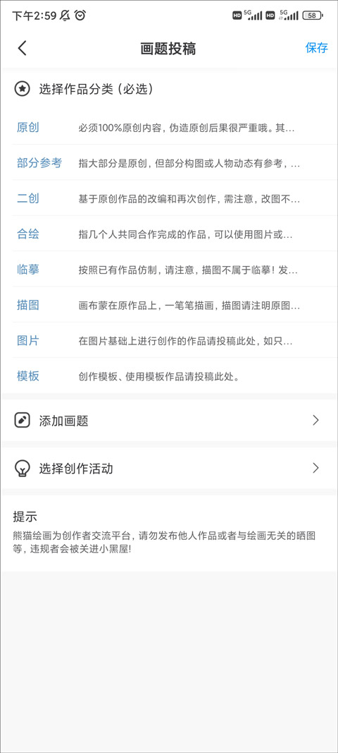 4、点击画题投稿,在这里你可以选择作品分类、添加画题、选择创作活动等,保存即可