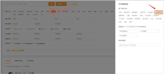 2、举个例子,如果我们想知道“美妆”号中有哪些播主推广“彩妆”的效果好,可以在【所属行业】中选择“美妆”,并在【带货直播数据】-【推广商品分类】中选择”彩妆“。