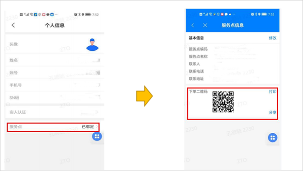 (1)掌中通—我的—点击头像—服务点—填写服务点编码—绑定成功—打印二维码——将二维码张贴至门店—用户扫码下单。