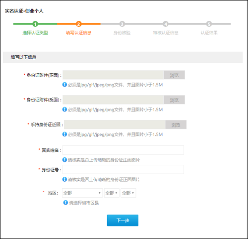 按照要求上传身份证正反面及手持身份证,并选择居住地区,信息填写完整后,点击【下一步】。
