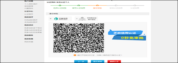 身份核验有两种方式,一种是通过芝麻信用进行验证,一种是通过手持身份证后台审核验证,验证方式选择后,点击【提交审核】,审核成功后方可进行后续操作;如发现认证信息有误,可点击【上一步】进行修改,如发现认证类型错误,则点击【撤销认证】,清空所有认证信息,并重新认证。