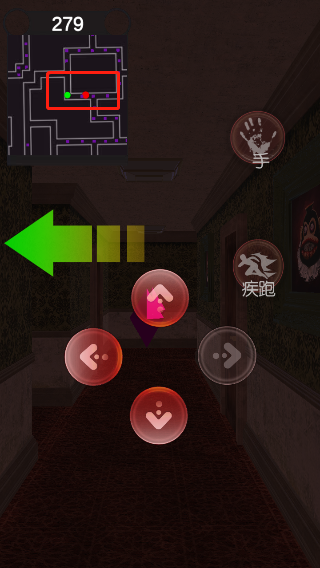 游戏内我们需要通过方向指示按键控制角色的移动,“手”可定身附近的怪物,“疾跑”可快速移动,躲避怪物的追赶