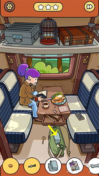 8、点击女士手里的手机,点击黄色标记点切换画面,切换后,点击红色标记点移动到上方的绿色圈内,回到火车界面,火车到站提醒后,窗户出现猫头鹰点击收起,猫头鹰列车物品找齐通关。