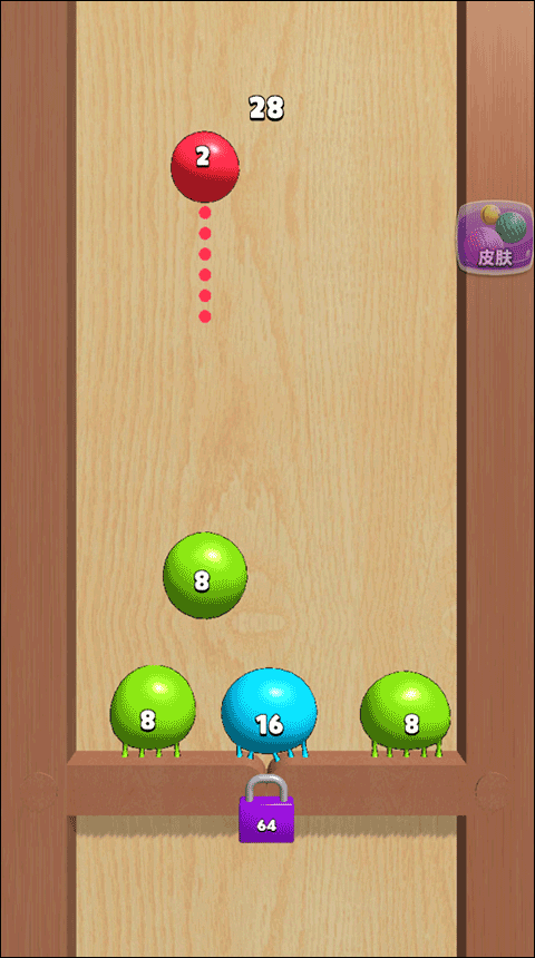 注意:玩家通过控制小球的下降位置来把小球进行合成,通过不断的合成来获得解锁的球球才能获得胜利,还有不同的障碍物会阻止你的方向,做好调整来进行合成。