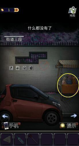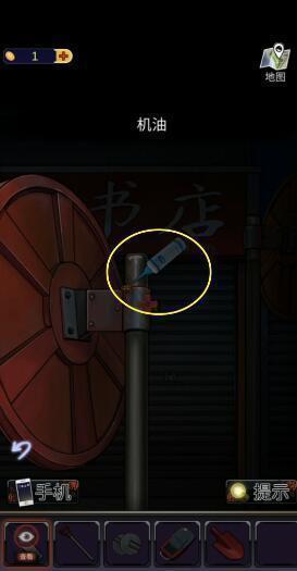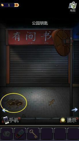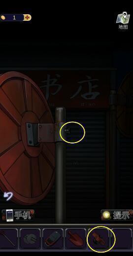 13、返回报刊亭的街道四段,点击下图圈出位置,使用钥匙打开玻璃门,得到【阀门】。