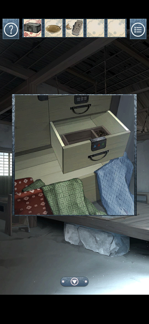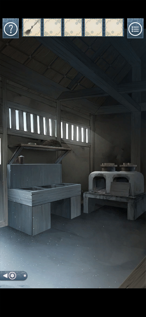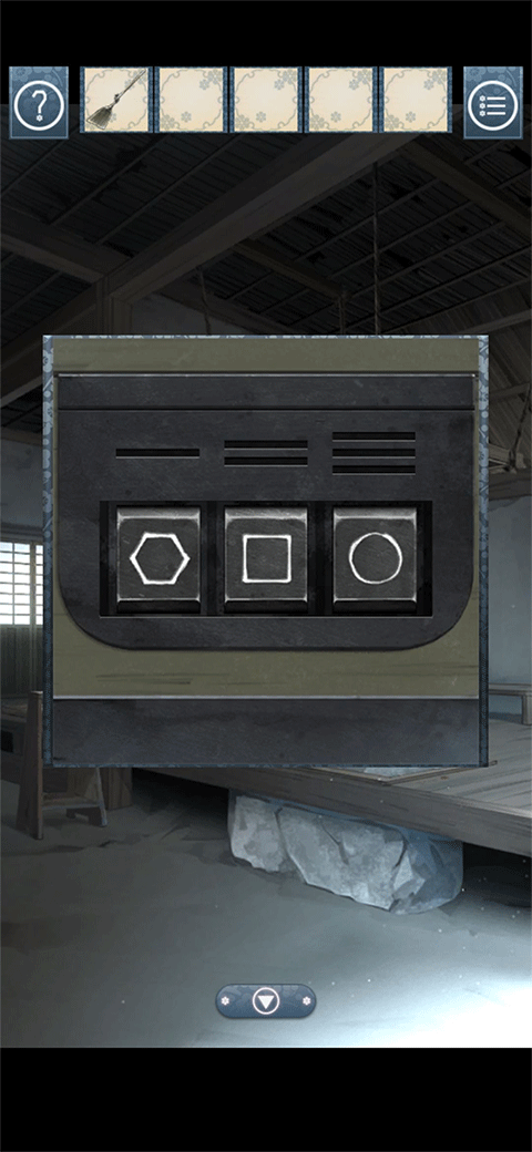 就近原则,先来到厨房把架子上的盐和灶台上的米装好,然后来到井边装上水,最后来到有一幅画的房间装上味增,不要着急回去,再去看看游戏最开始的地方,发现三个果实后面有图案,点进去以后记下来,然后回到拿衣服的房间