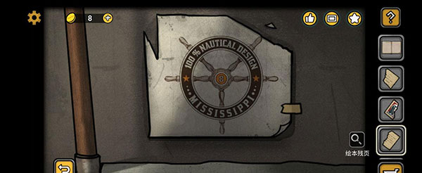 3、第三个绘本在一号船员室右侧窗与中间柜子交界的地方点击放大后,最里面墙跟窗交汇的角落里用铁丝勾出来一张小纸条就是。
