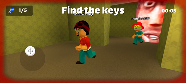 2、游戏内如图,左边控制移动,右边控制方向,玩家需和电脑角色尽快找到五个钥匙开门逃脱;