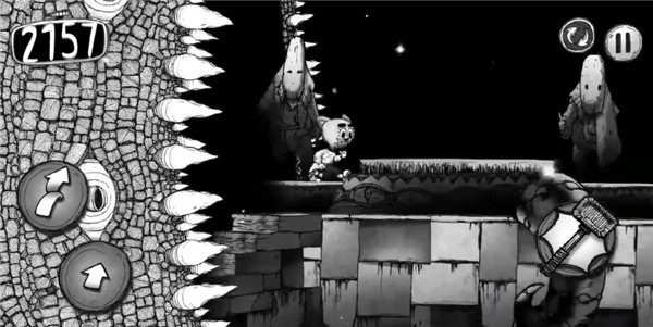 1、游戏的美术风格带有一点复古,身后还有巨型的怪兽在追逐着你向前进;