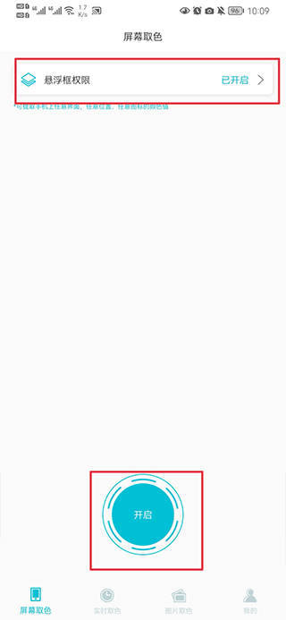 一、打开颜色识别取色器app,在屏幕取色中上方开启悬浮框权限、并点击下方开启按键