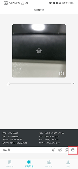 三、实时取色:将摄像头中间取色点对着实物取色后点击下方存储颜色即可