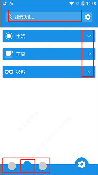 2、点击下方的小球球即可切换界面,显示为绿色的小球就是你当前所在的界面,在这里提供了生活、工具、极客三大类工具,点击右侧剪头即可展开查看详细功能,同时也可以再上分的输入框中输入关键词来快速查找使用功能;