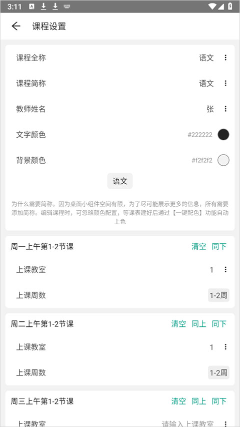 1、极简课表app可自由设置上午、下午、晚上各阶段课程数量。