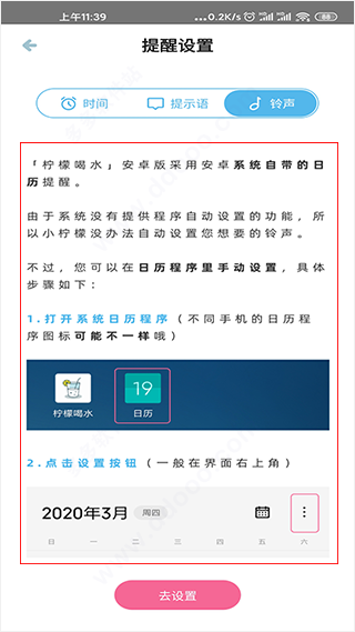 4、如果想用铃声提醒,那么有点麻烦,你可以根据系统为你提供的图文教程来一步一步设置;