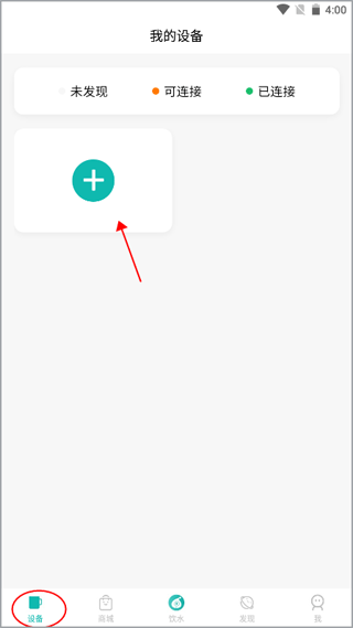 1、打开软件后自动进入到“饮水”界面,跳转到“设备”这个模块后,点击上方的加号图标。