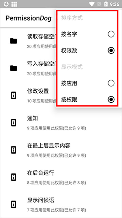 1、下载安装好权限狗app,打开应用点击右上角三条横线的图标,选择应用排序或者权限排序;