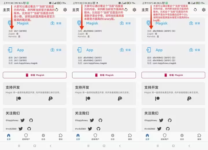 Magisk官方原版的所有版本,从表面上看区别就是版本号的不同,不同的版本虽然在页面上和包名是一样的,但是可以通过其后的版本号来进行区别,例如下图从左到右依次为稳定版、金丝雀版、调试版。不然发现稳定版的版本号是有小数点的,而金丝雀版是没有小数点,调试版就不用多说后面带有字母D(英语debug的首字母)