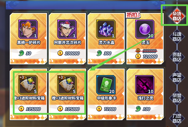 声望商店:勇闯尸魂界出的材料购买。一直买碎蜂碎片(SSR必买啊)刀灵进阶石必买,其他看自己需求。