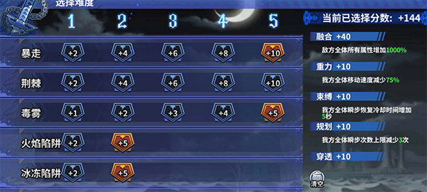关于积分选择,复苏、荆棘、融合具有高难度挑战性,在实力不足情况,可以不选择这些,从而更轻松通关。另外核算积分可以根据(目标积分=固定关卡积分80积分+自选难度积分),所以选择自选关卡积分的时候,可以通过精准核算目标积分再进行选择。