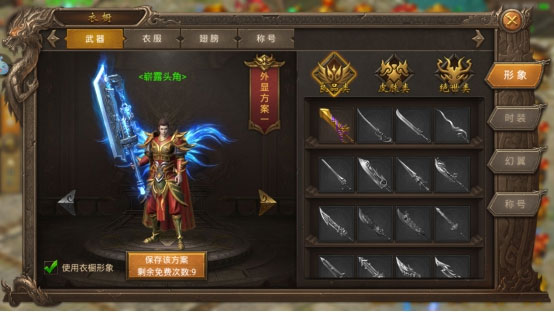 武器有三类分别是良品类、皮肤类、绝世类,获得类别中的道具就可以在衣柜形象中来选择了。