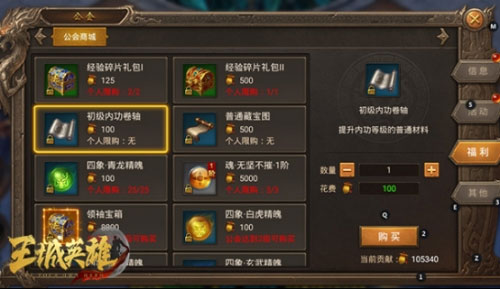 然后是公会商城,每天完成公会活动里的任务之后,我们可以获得贡献,贡献可以在公会商城里面换取自己想要的东西。