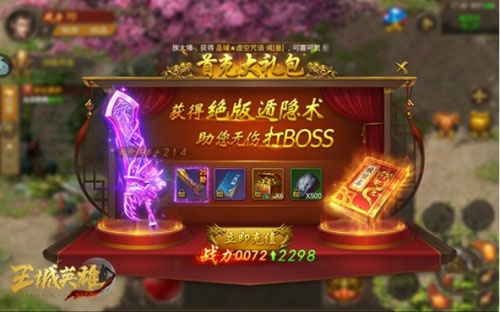 PK神技,免伤超多。出门在外,必备之物。这里老王强烈建议入手。如何获得?在开服狂欢活动中的超值礼包里,花点钻石买礼包,就可获得武力盾技能书。