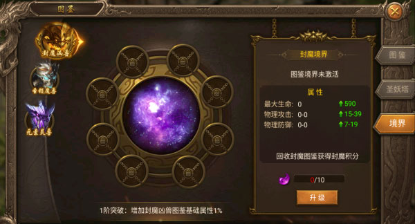 回收多余的图鉴卡为对应的图鉴积分,消耗图鉴积分提升对应的图鉴境界(封魔、圣锁、元素),增加图鉴基础属性。