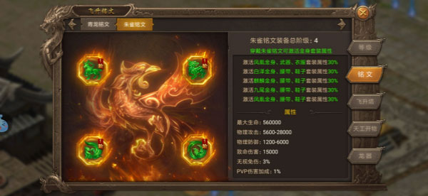 (1)铭文槽位分为4个:朱雀铭文 盔·链, 朱雀铭文 腰·鞋 ,朱雀铭文 戒·镯,朱雀铭文 剑·甲,分别对应金身装备的2件套套装效果;