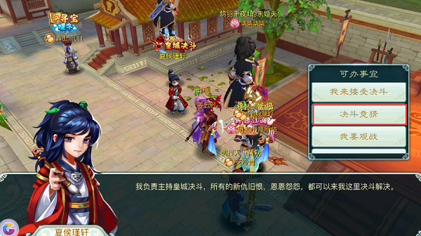 一纸战书,万众瞩目,紫电惊雷,风云汇聚,京极之地,皇城之巅,英雄再起,一决高下。皇城决斗为新出一种pk玩法。那么,具体的流程是什么样的呢?下面让小编来为大家做详细介绍。60级以上玩家可以去寻找开封城中的夏侯瑾轩,向自己的宿命对手下战书,并在众人的见证下进行决斗: